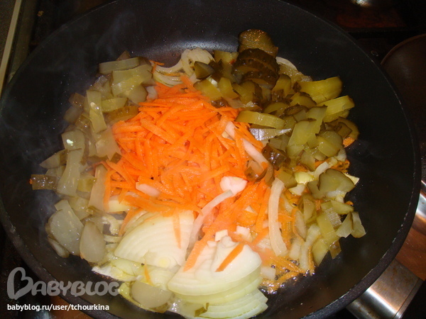 Рассольник готовили обычно: бульон на говяжьей грудинке с кореньями. Отдельно отвариваем замоченную перловку. Вынимаем мясо, разбираем, выкидывая кости. В это же время делаем зажарку из моркови и лука. Секрет в том, что в зажарку добавляем и соленые огурцы: