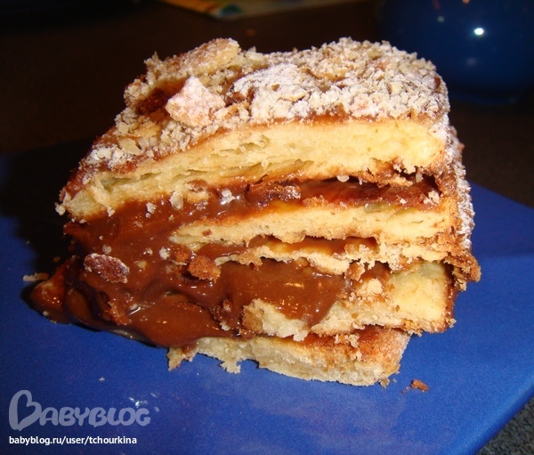 Еще накопилось много старой сметаны, поэтому решила вспомнить детство и сделать тортик со сгущенкой. Для коржей взбить 3 яйца со стаканом сахара (я использовала ванильный сироп, а можно любой фруктовый сироп), добавить 1 пачку размягченного маргарина, 250 г сметаны, замесить эластичное тесто. Разделить на 5 частей. Раскатать толщиной в 5 мм, обрезать: