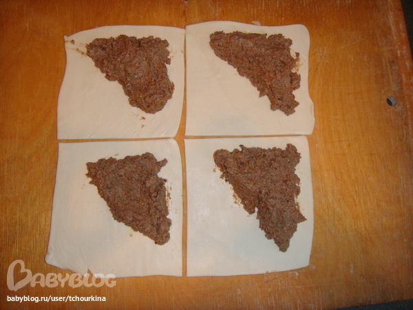 Тесто немного раскатать, нарезать на квадраты, разложить начинку: