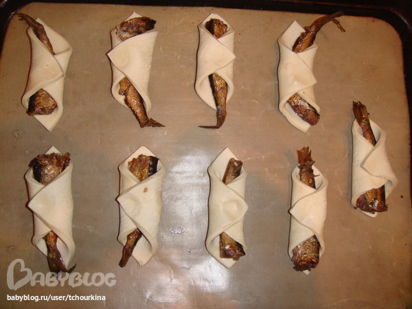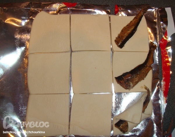 Тесто раскатать, нарезать на квадраты примерно 6 х 6 см. Разложить по диагонали шпротины