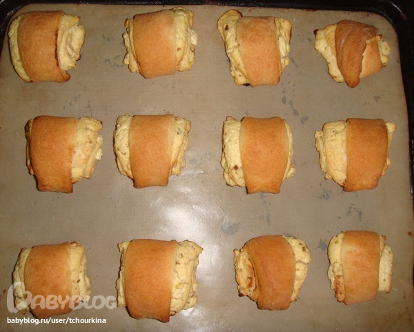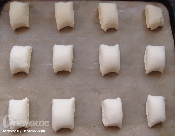 Завернуть противоположные концы квадрата, защипнуть. Разложить на противень, смазать яйцом:
