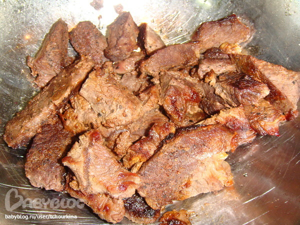 Для начинки поджарить мясо, посолить, поперчить.