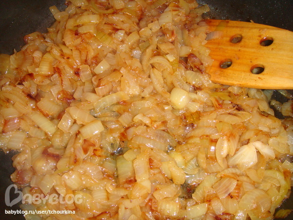 Лук порезать мелкими кубиками, потушить до мягкости и приятного цвета. В конце тушения посолить: