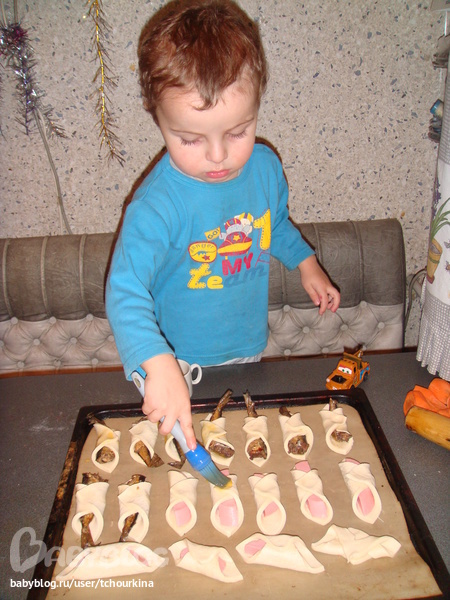 Вот что у нас получилось: пирожки с мясом, конвертики со шпротами, колбаса в тесте, рулеты с творогом. Фотоотчет прилагается :)