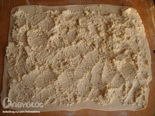 Тесто тонко раскатать. Разложить начинку: