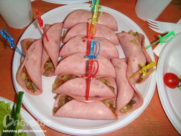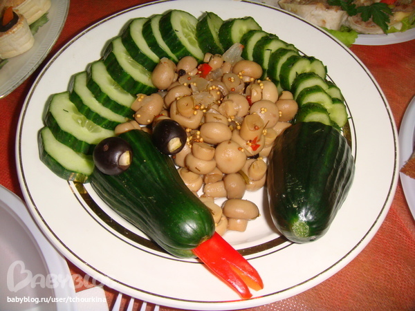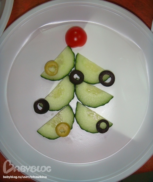 И белые тарелки (пустые) я не люблю. Так что на каждой была елка из огурца: