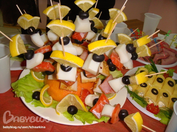 Рыбное ассорти на шпагах (лимон, оливки, копченый кальмар, семга слабой соли, патус):