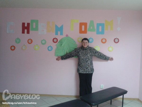 На работе Я организовывала корпоратив для наших сотрудников. Про подарки уже рассказывла. Еще сделала елку с поделаниями на каждой ветке. Из цветной бумаги нарезала буквы. Были и елочные шары с подарками в виде картинок (ключ - жилье; соска - ребенок; монеты - к деньгам и т.п.) Вот я накануне корпоратива все развесила на стене:
