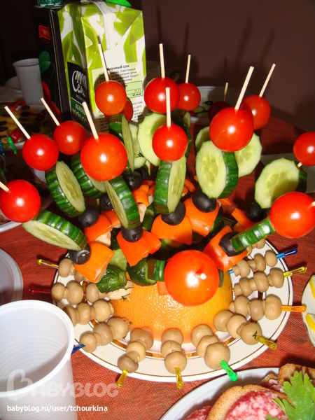 Овощи на шпагах (черри, св.огурец, маслины, маринованный чеснок, болгарский перец, свежепросоленный огурчик). Внизу - маринованные грибы на шпажках: