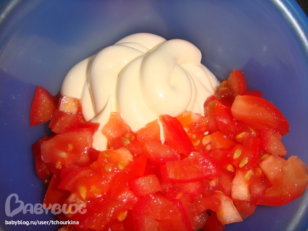 Помидоры без кожи и семян нарезаю мелкими кубиками и смешиваю с майонезом.