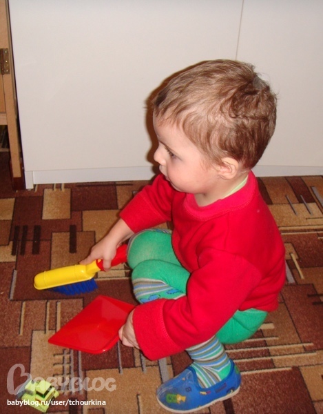 Сейчас Вовуся любит нам подражать во всем. Поэтому купила ему сметочку с совочком: