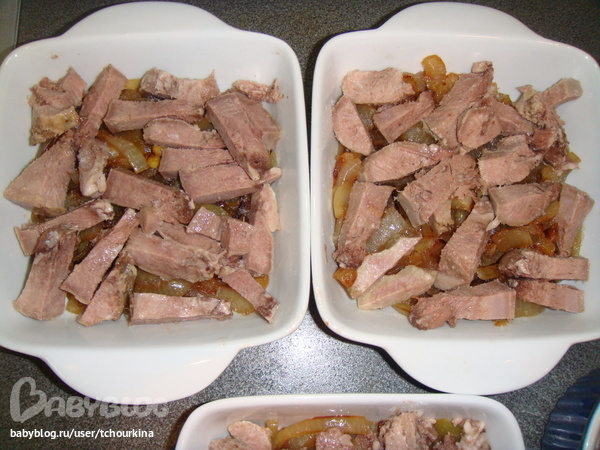 Отварной язык нарезать брусочками и положить на лук: