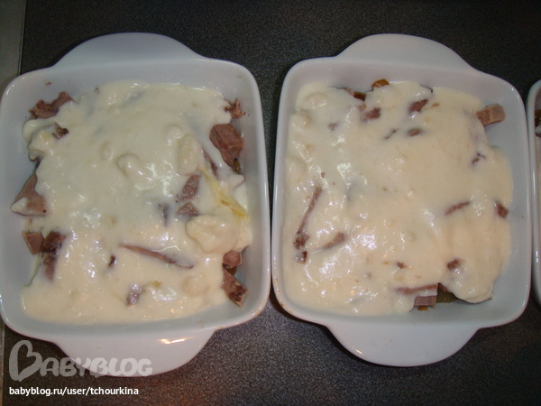 На сухой сковороде поджарить 3 ст.л. муки, добавить 1 ст.л. сл.масла, перемешать, влить сливки 20%, вскипятить соус. Залить этот соус в форму: