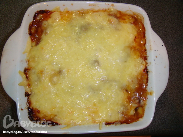 Поставить в духовку на максимальный огонь. Готово как только сыр запечется сплошной корочкой: