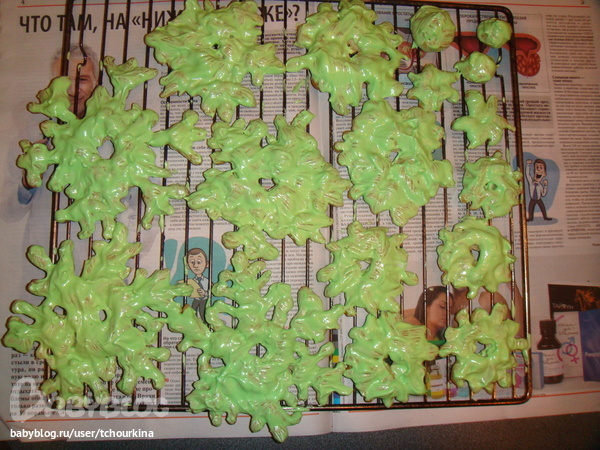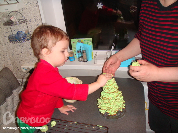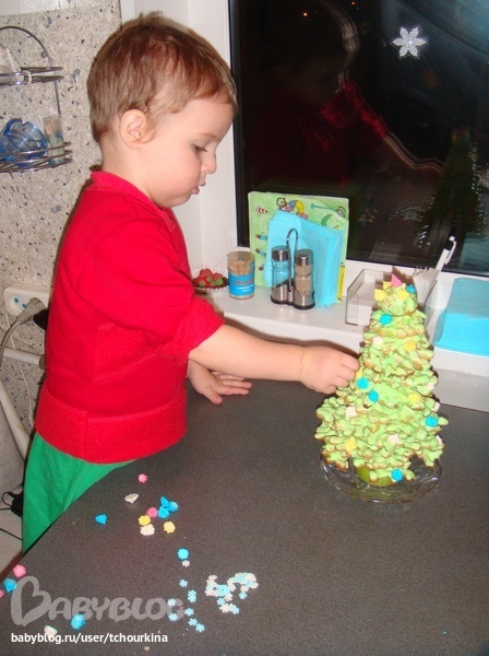 Потом доставить кулинарные посыпки и украшения и на капельки глазури прикрепить к елочке (это тоже работа для Вовуськи):