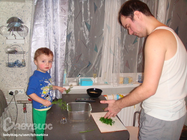 В процессе готовки Вовик тоже принимал активное участие. Вот папе помогает делать баклажанные рулетики: