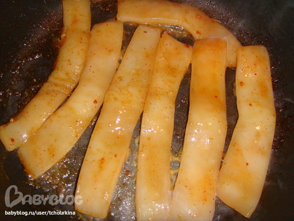 Полоски кальмаров тоже сутки вымачивала в остром пряном соусе и жарила на сливочном масле: