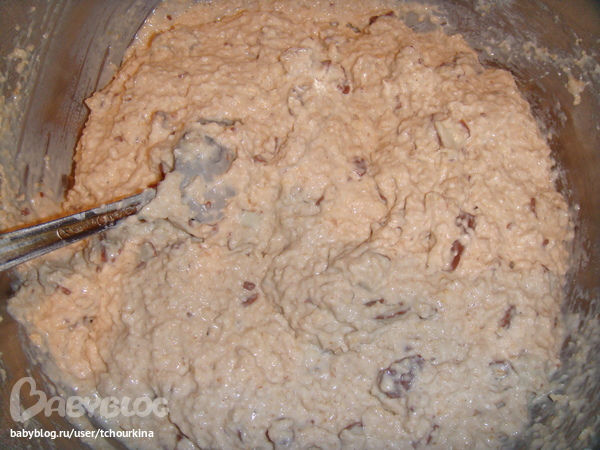 2 стакана геркулеса залить 1 стаканом подогретого кефира (я использовала сметану, разбавленную кипятком) на 20 минут. Потом добавить 3 ст.л.меда, 1 яйцо, 1 пакетик разрыхлителя теста. Размешать. Добавить размоченный изюм (можно использовать нарезанную курагу; у меня кусочки шоколада):