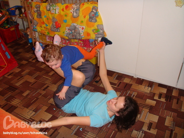 Еще на этой неделе Вова помогал маме стройнеть. Она делала с ним упражнение "самолетик":