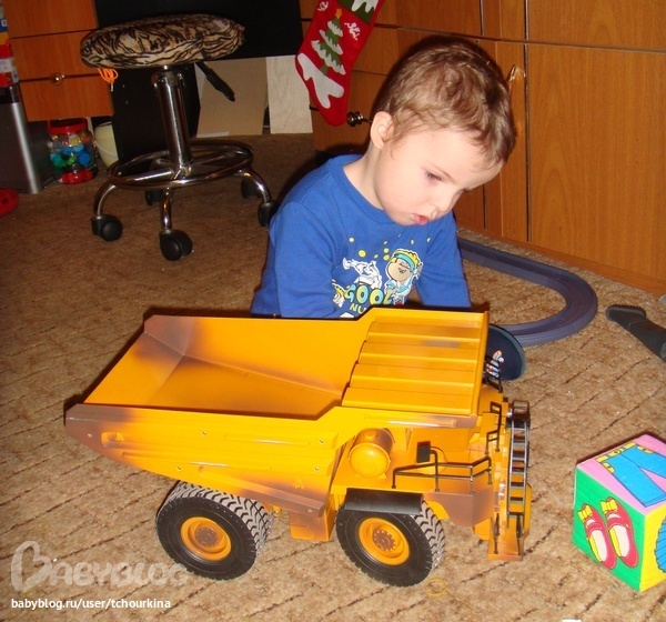 Постепенно привыкает к подаренному мной огромному самосвалу и уже не только катает его ручками: