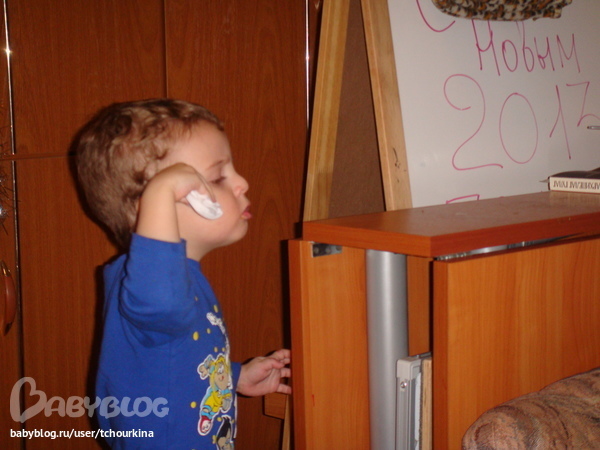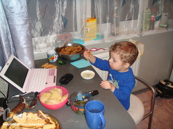 Добровольно кушать Вовик по-прежнему не любит. Еда должна сопровождаться (или отвлекаться?) мультиками в телевизоре, ноуте или телефоне):