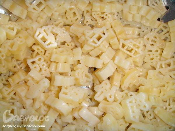 Мы его любим с макаронами. По Вовиному выбору в этот раз у нас макароны "Транспорт":