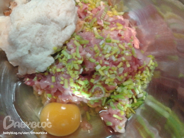 Осталась у нас 1 куриная нога и 1 голень. Мясорубку пачкать не хотелось. Порубила ножом вместе с луком-пореем, добавила намоченную булочку: