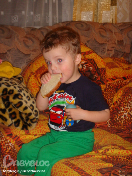 И вот после всего этого изобилия (которое в Вовика не запихнуть!!!), наша деточка попросила хлебушка... Прямо из анекдота: "Ваши обедали? - Обедали. - А сейчас что делают? - Да хлеб жуют!" Вот она наша сиротинушка с ломтем: