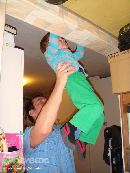 До упоения скачет на моем диване под "баба шла-шла-шла..." А с папой здорово висит и подтягивается на турнике: