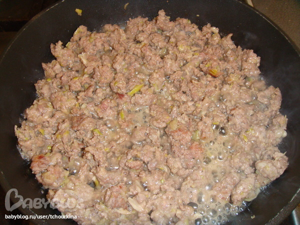Фарш с луком и чесноком обжарить на сухой сковородке. Посолить, поперчить, добавить немного сахара, сушеный базилик (или итальянские травы):