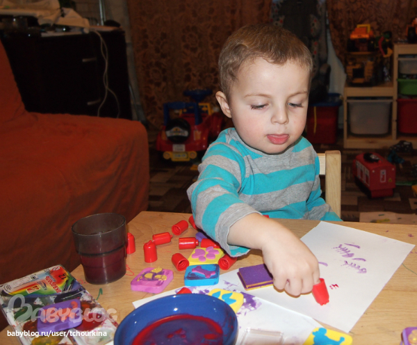 На этой неделе вернулись к штампикам. И опробовали подаренные еще на НГ пальчковые печати:
