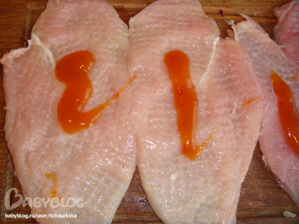 Срезанные с толстых частей куриной грудки кусочки нарезать тонкими полосочками: