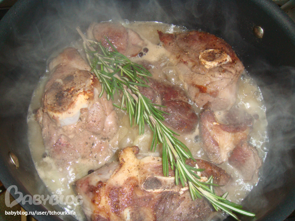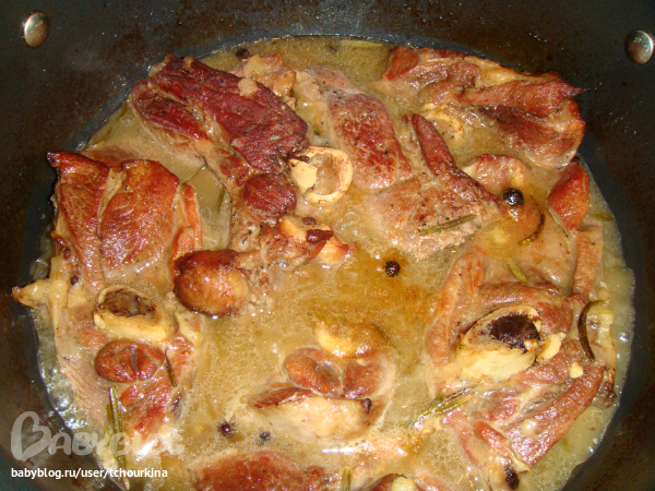 Обжарить до румяной корочки, переложить в казанок, добавить много репчатого лука и стакан воды. После закипания добавить можжевельник и веточку розмарина: