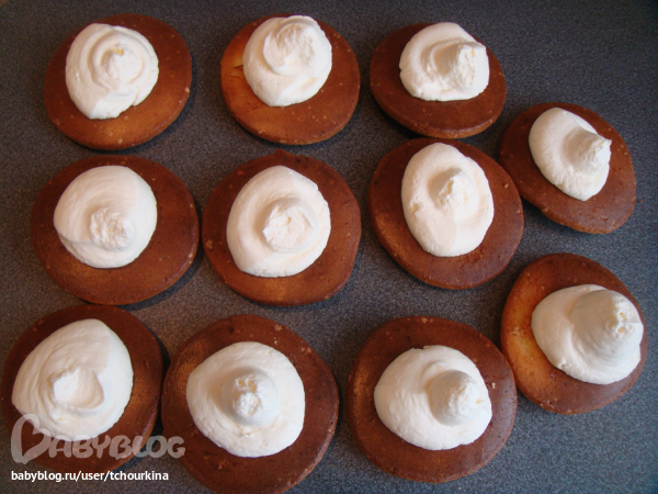 Половинки пропитать сиропом (у меня клубника и ментол). На одну часть выдавить крем (у меня опять из маскарпоне):