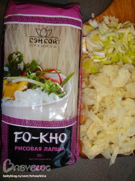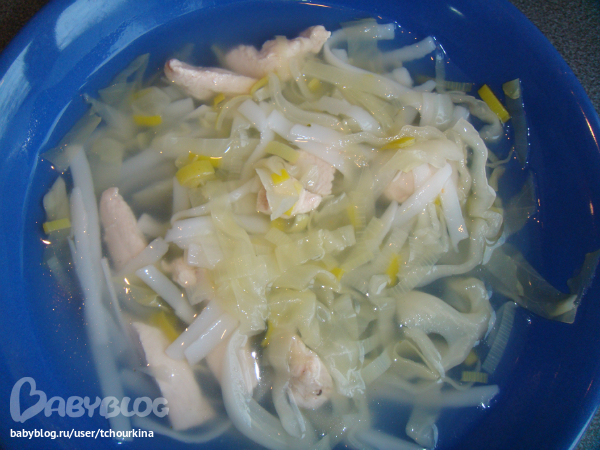 В кипящую подсоленную воду ОДНОВРЕМЕННО опустить курицу, свежую капусту и рисовую лапшу: