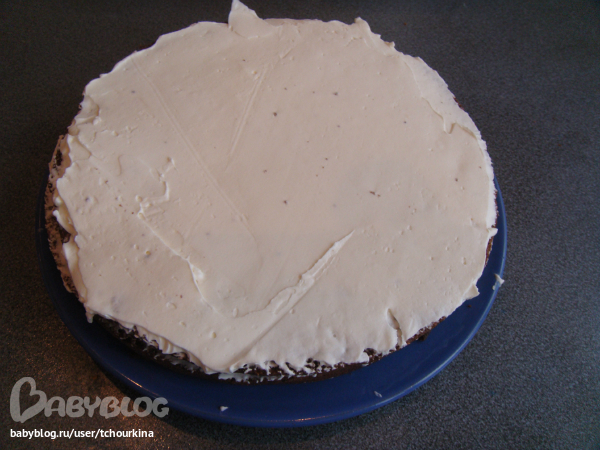 Пропитать коржи сиропом, перемазать кремом (у меня крем мой любимый и много раз описанный - из сливок с маскарпоне):