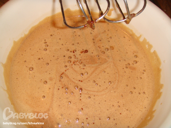 Развести 3 ч.л. растворимого кофе в половине чашки кипятка (или сварить очень крепкий кофе). Остудить и вылить в яичную смесь: