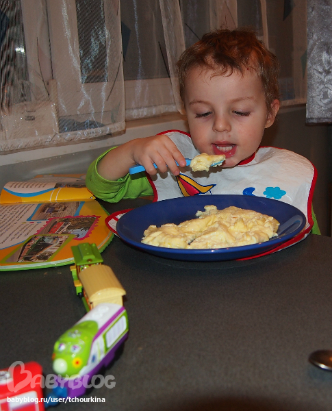 И даже во время завтрака (кроме каши Вова обожает еще омлет!):