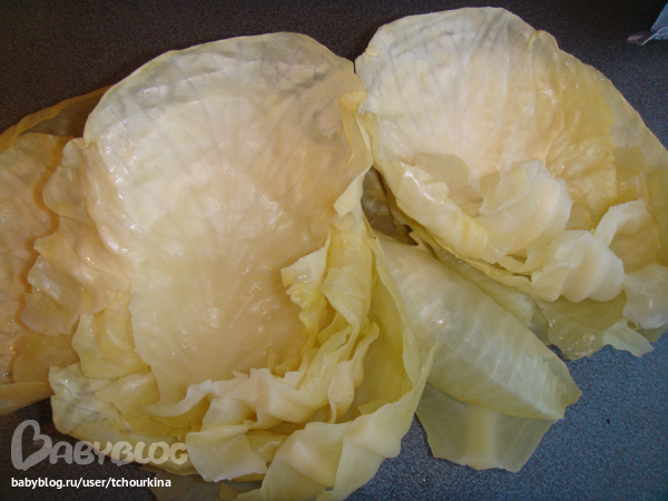 Проварить кочан 3 минуты с одной стороны и 3 с другой. Остудить под холодной водой и разобрать на листья: