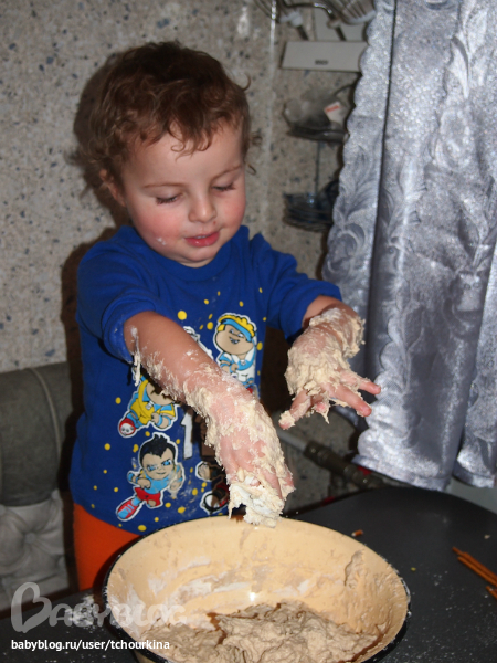 Начнем с пирожков. Вова в этот раз лично замешивал тесто. Позволила ему извозюкаться с ног до головы: