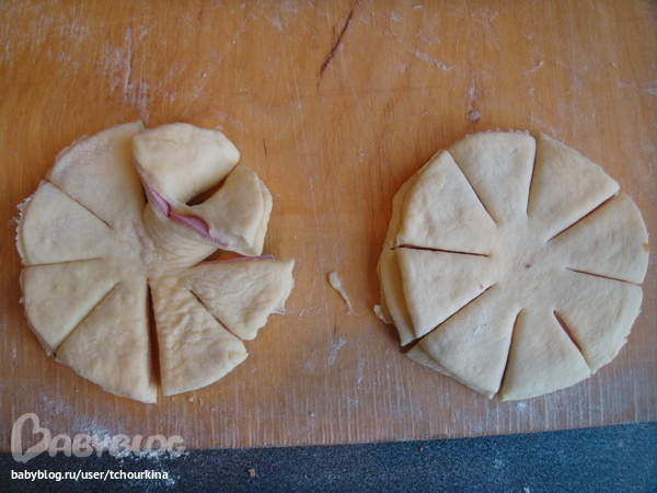 Закрывть колбасу вторым кружком теста. Сделать 8 надрезов, не доходя до центра: