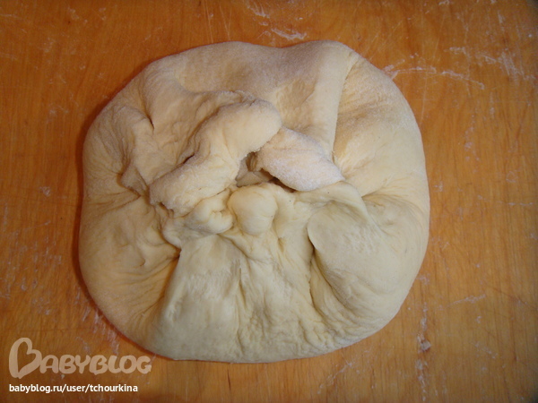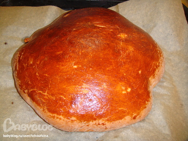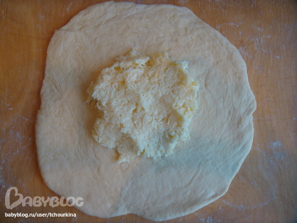 Раскатать лепешку в пласт. Положить на противень швом вниз. Смазать разбитым яйцом. Выпекать до красивого темного цвета:
