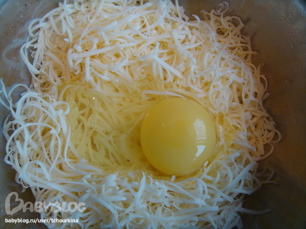 Колбаса закончилась, а тесто осталось. Решила сделать хачапури. Сначала натереть для начинки сыр и перемешать его с яйцом: