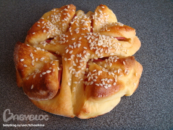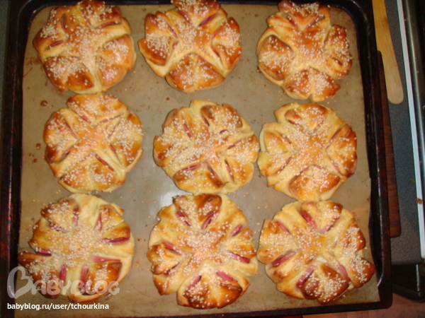 Затем смазать разбитым яйцом, посыпать кунжутом. Выпекать в прогретой духовке до золотистого цвета: