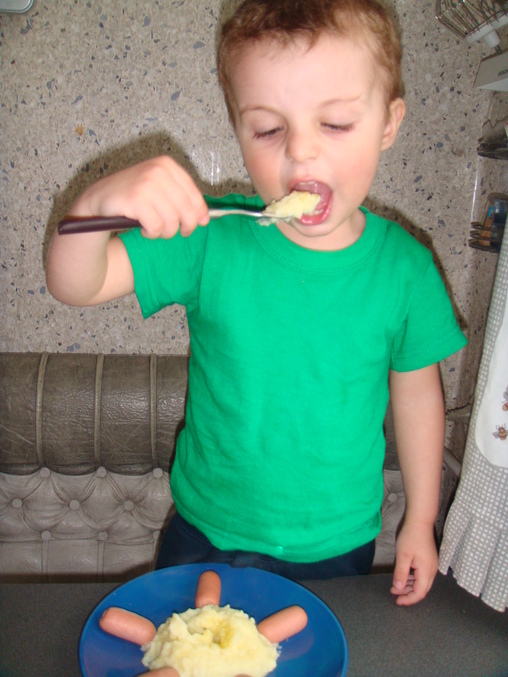 Впрочем, Вовик у нас тоже выкомеда в еде. Изголяюсь по-всякому, чтобы накормить его. Вот пюре с сосисками в виде солнышка: