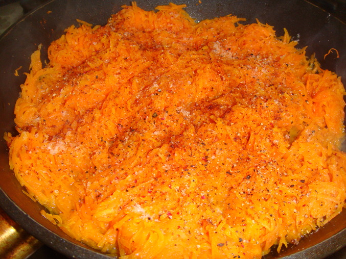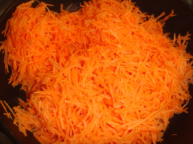 Морковь очистить, натереть на мелкой терке. Потушить до готовности на растительном масле: