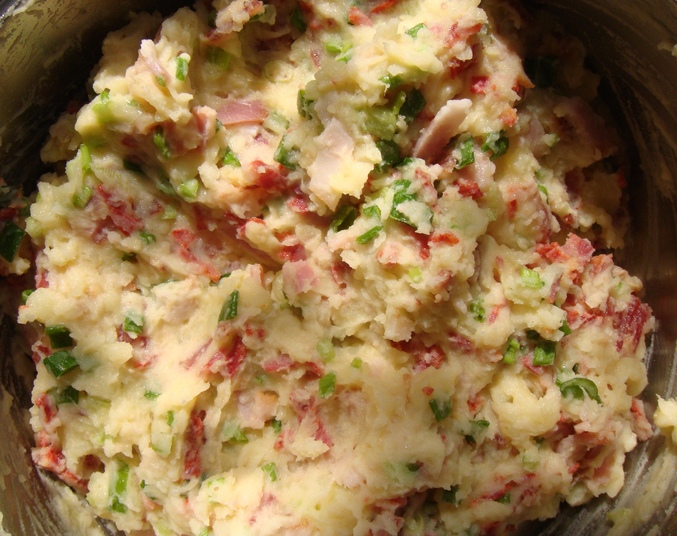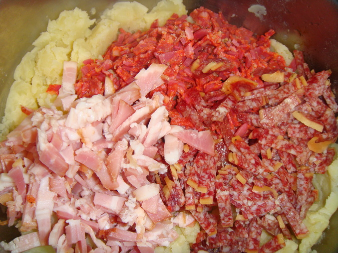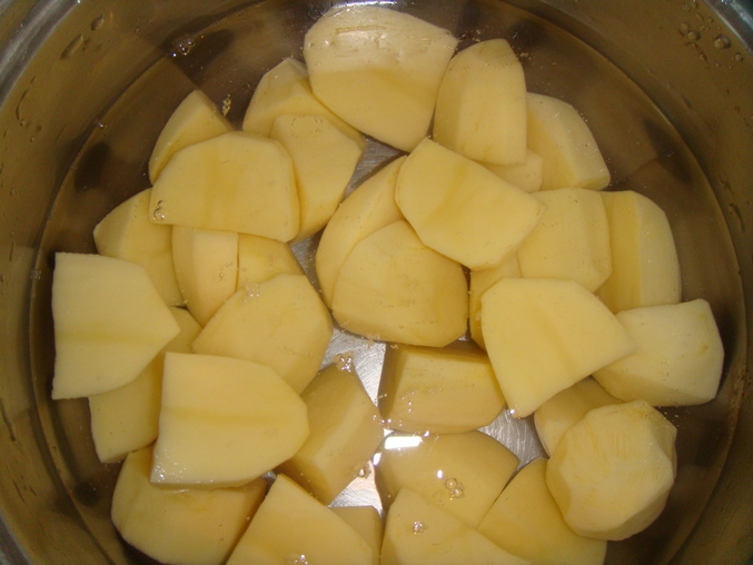 Отварить картошку, слить воду, растолочь (или пропустить через мясорубку):