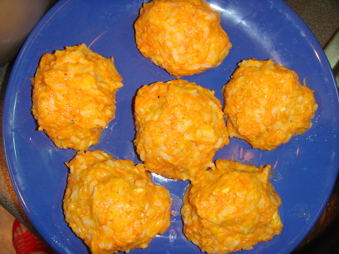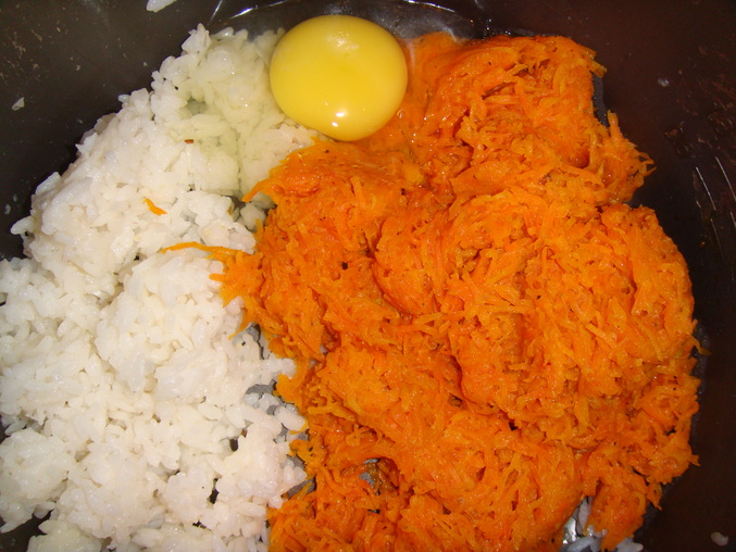 Сварить вязкую рисовую кашу на воде с добавлением соли. Кашу соединить с морковкой, добавить яйцо и перемешать: