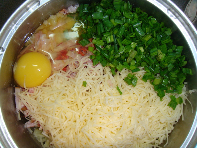Добавить натертый сыр, яйца, соль, хорошо перемешать: