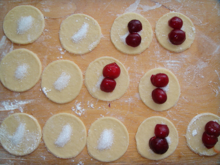 Раскатать тонким слоем, нарезать кружки. На кружки посыпать сахар, разложить вишню без косточек: